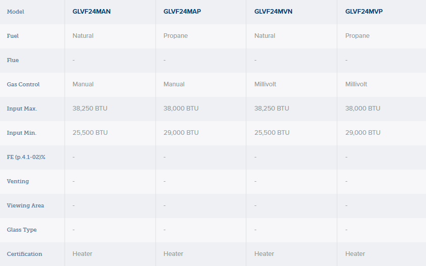 - Hi/low Millivolt or manual valve with variable adjustment of flame and BTU